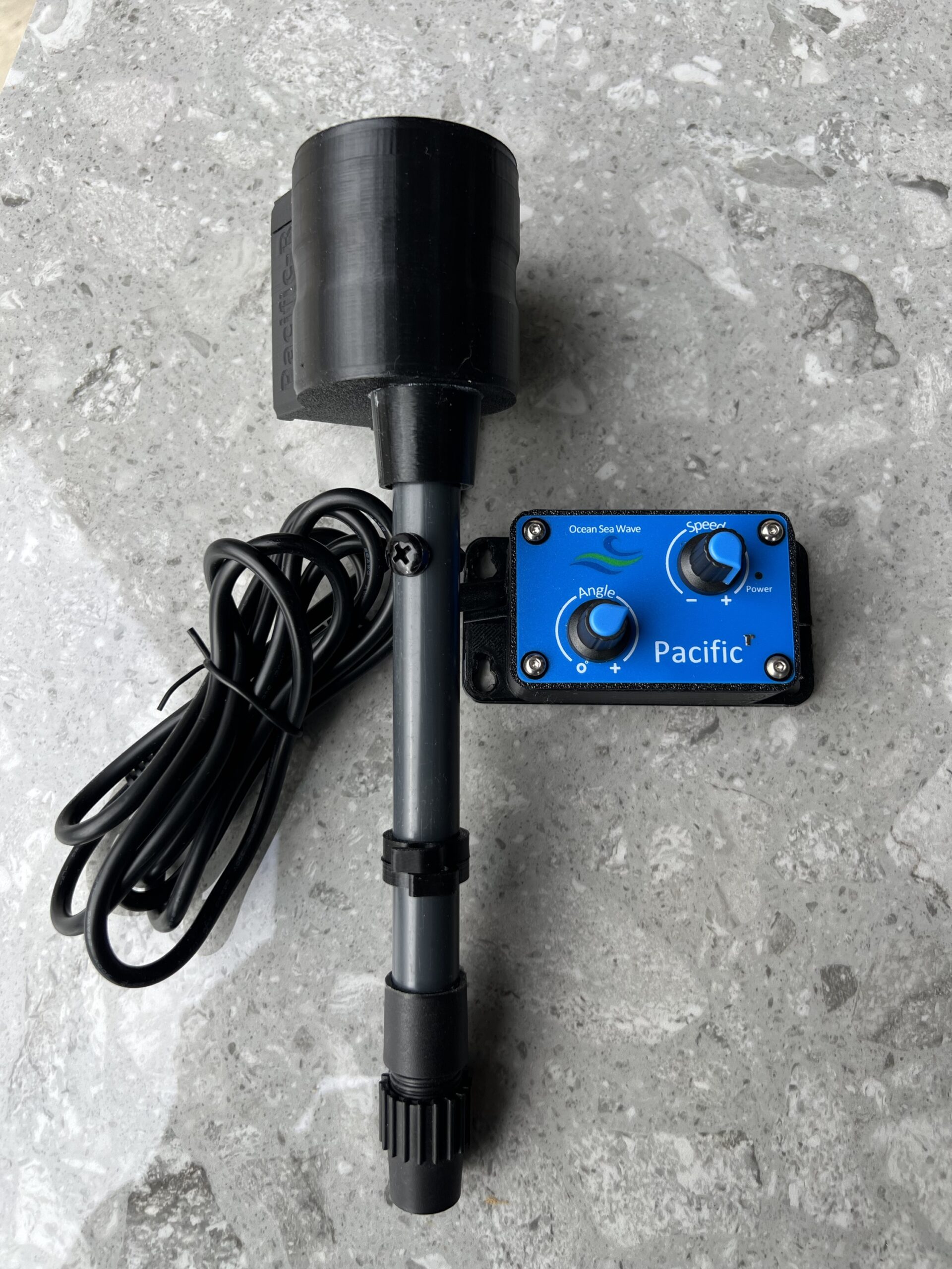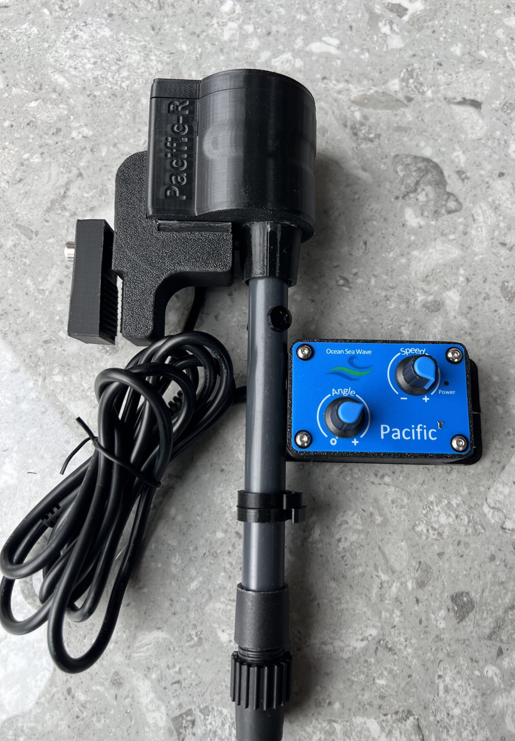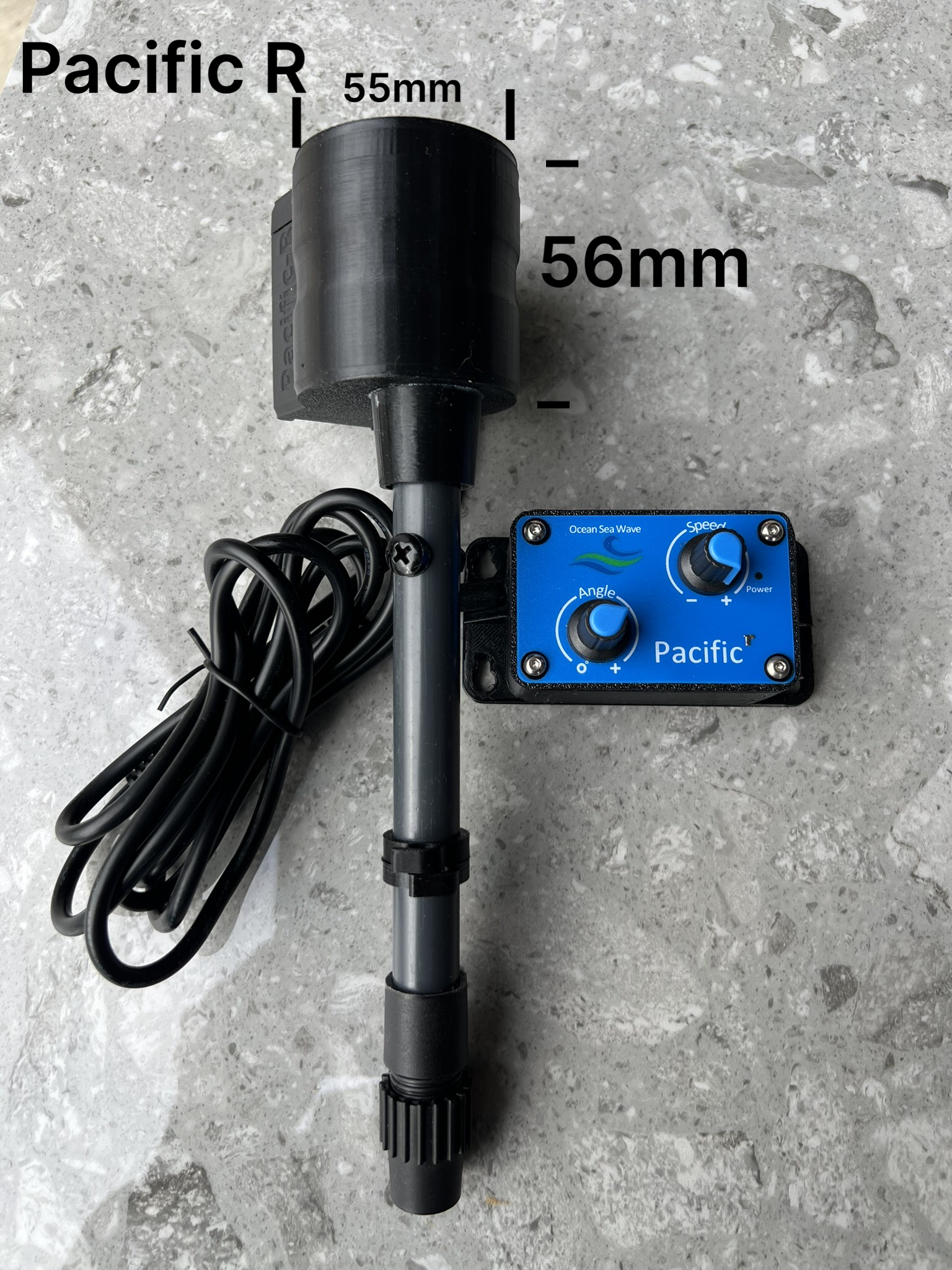The Pacific R is the Remote control unit for the Pacific Range ,it now has a silent 5 volt upgraded stepper motor with a 1:9 meter umbilical cable ,the cable has a break point at 430:MM from the the Motörhead so allowing for removal without taking all the cable and controller out . You can instal a wave maker to the max of 15,000 lph at a depth of 120 MM on constant flow and not on pulse !