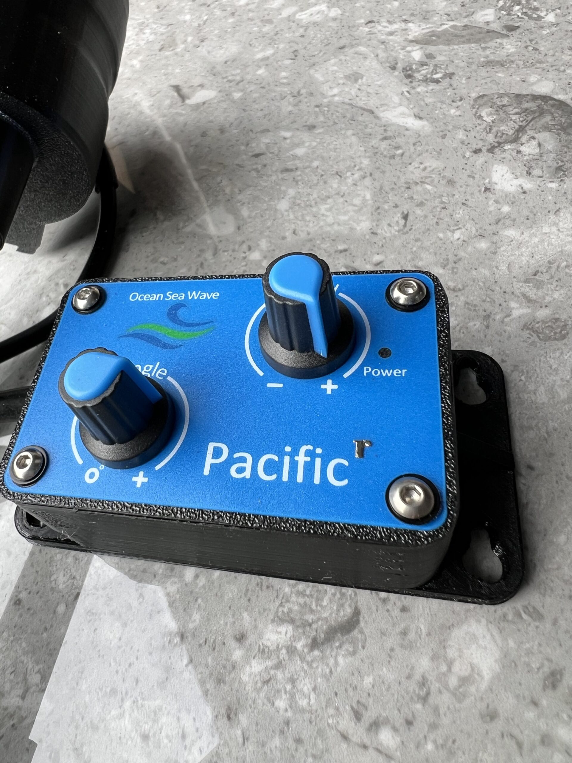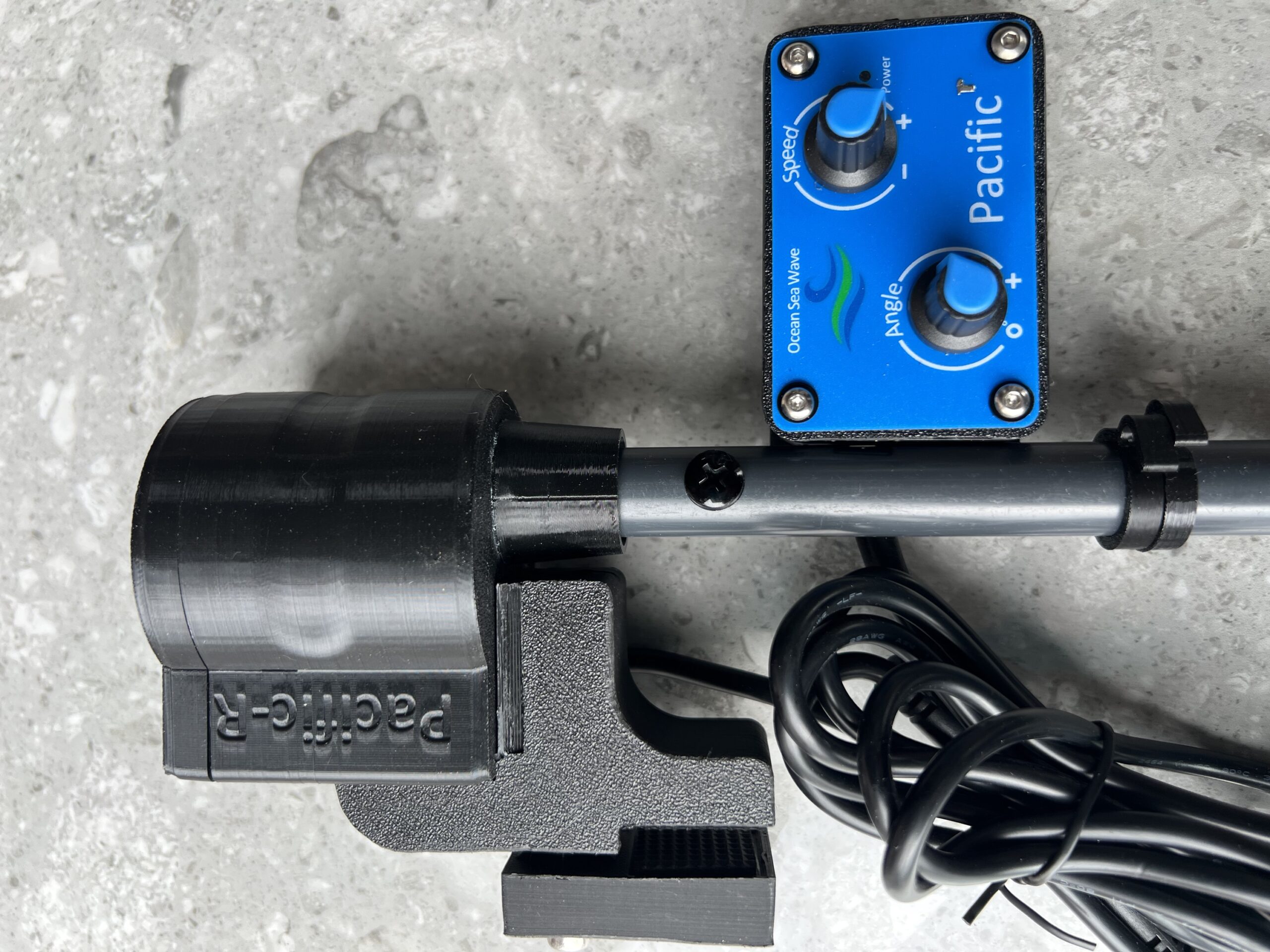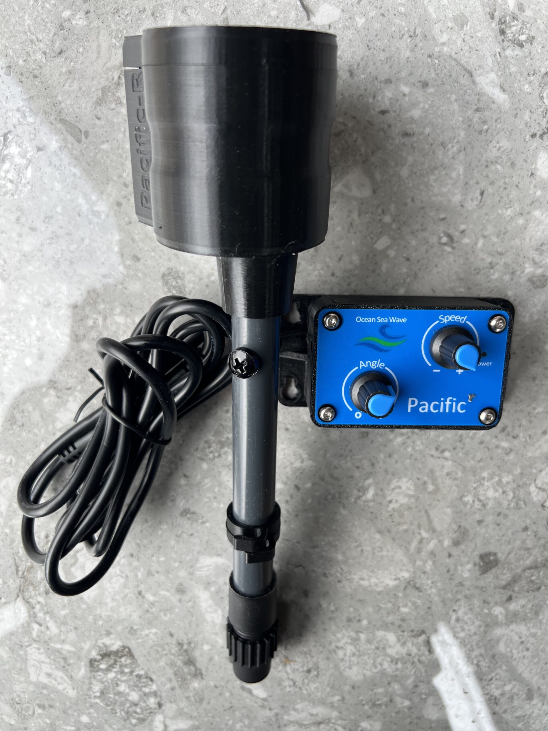 The Pacific R is the Remote control unit for the Pacific Range ,it now has a silent 5 volt upgraded stepper motor with a 1:9 meter umbilical cable ,the cable has a break point at 430:MM from the the Motörhead so allowing for removal without taking all the cable and controller out . You can instal a wave maker to the max of 15,000 lph at a depth of 120 MM on constant flow and not on pulse !