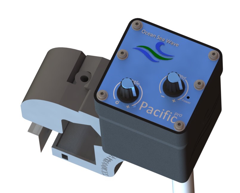 The Pacific Pro is the big Brother of the family of Seawave Oscillation devices it measures 72mmx72mmx 92 MM Tall unit with an angle adjustment from 170 degree to 0 degree and the speed can also be manually adjusted ,it can cope with flow pumps to a maximum volume of 25,000 lph at a depth from surface of 120 MM and 15,000 lph at 200 MM .The measurements given here are based on the unit being clamped to the rim of the aquarium .This unit comes with the Mega clamp to fit it too your aquarium ,the bracket will fit braced and rimless aquariums and the jaw opens up to 38 MM,the unit also comes with a telescopic drive rod assembly and a universal magnetic mount that allows either vertical or horizontal wave maker mounting .